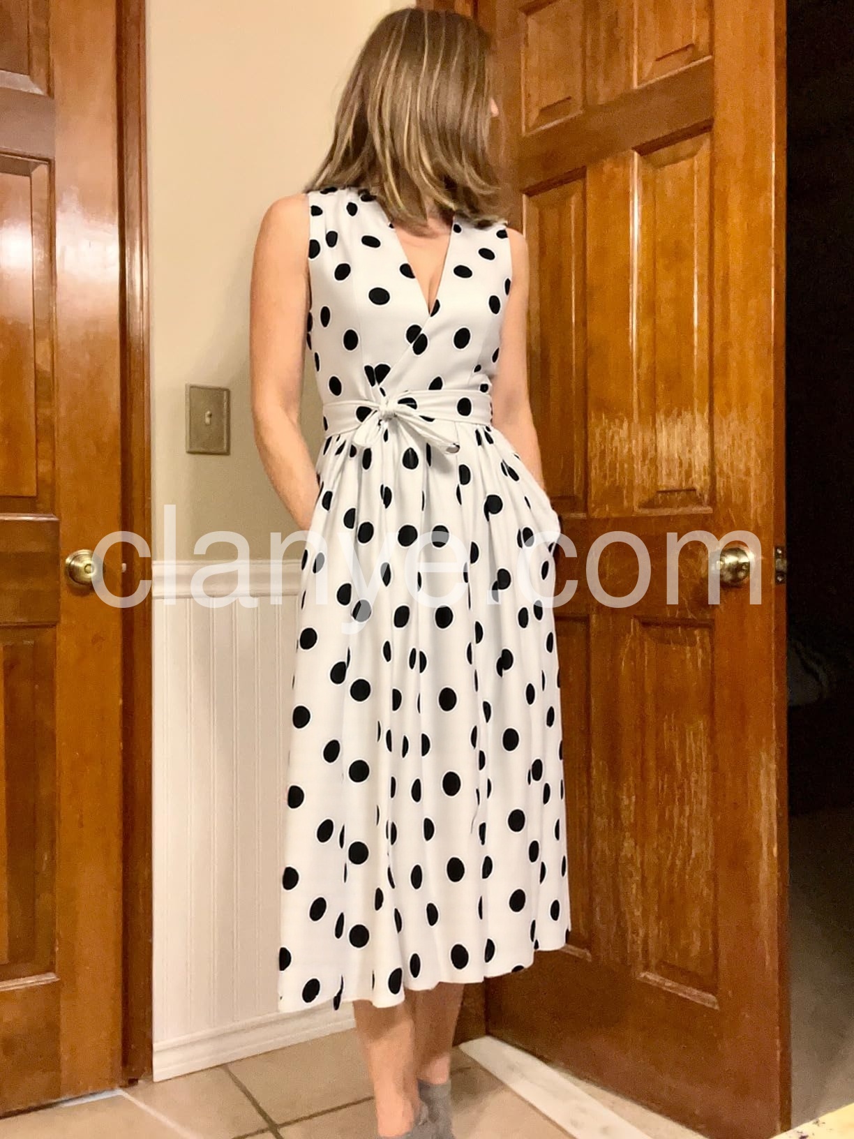 This dress is fantastic! The white background with black polka dots makes it look very chic and versatile.